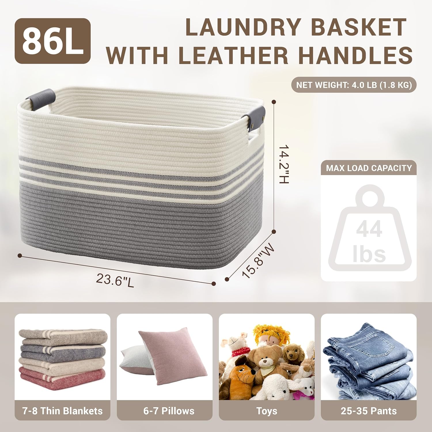 86L Extra Large Laundry Basket with Leather Handles for Living Room Storage, Woven Rope Baskets for Blanket, Kids Toy, Gifts, Wicker Hamper for Bedroom Dirty Clothes, 24"x16"x14" White Grey