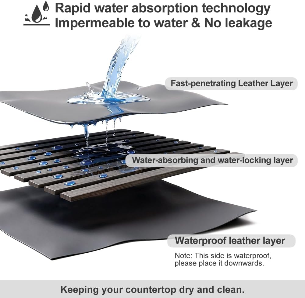 • 【WATERPROOF BOTTOM, NO WATER TRAPED】The upgraded stone drying mat comes with a PU leather cover, which has a water absorbing function on the surface and a waterproof bottom, effectively preventing water from exposing from the bottom and soaking the kitchen countertop