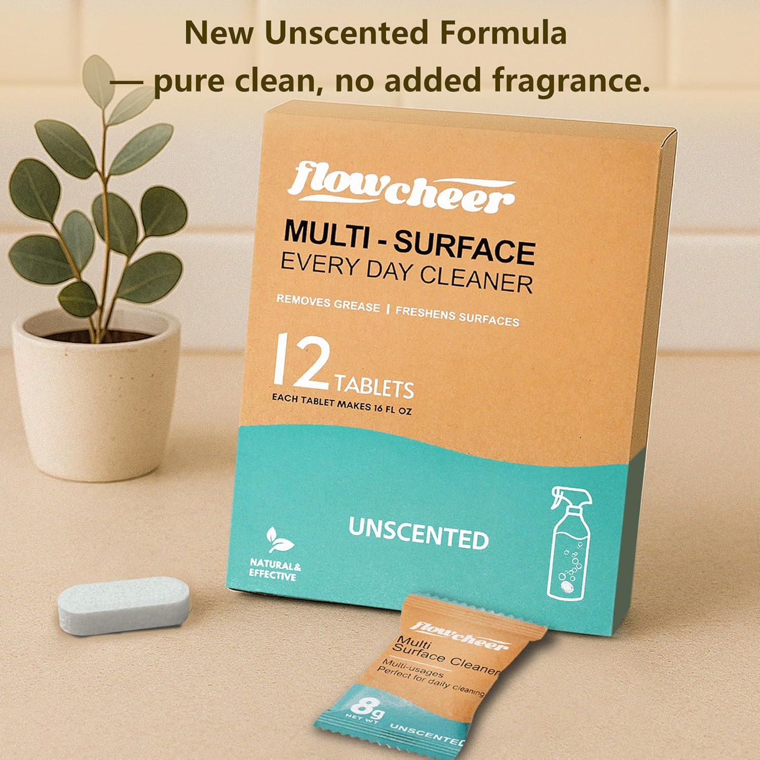 • MULTI-SURFACE CLEANER REFILL: All purpose cleaner tablets do not only Save Space in your cabinet,but also re-fill your bottles repeatly and save your money to buy bulk traditional cleaners.Simply add a FLOWCHEER all-purpose cleaning tablet to water in a reusable spray bottle and you're off to a clean house.