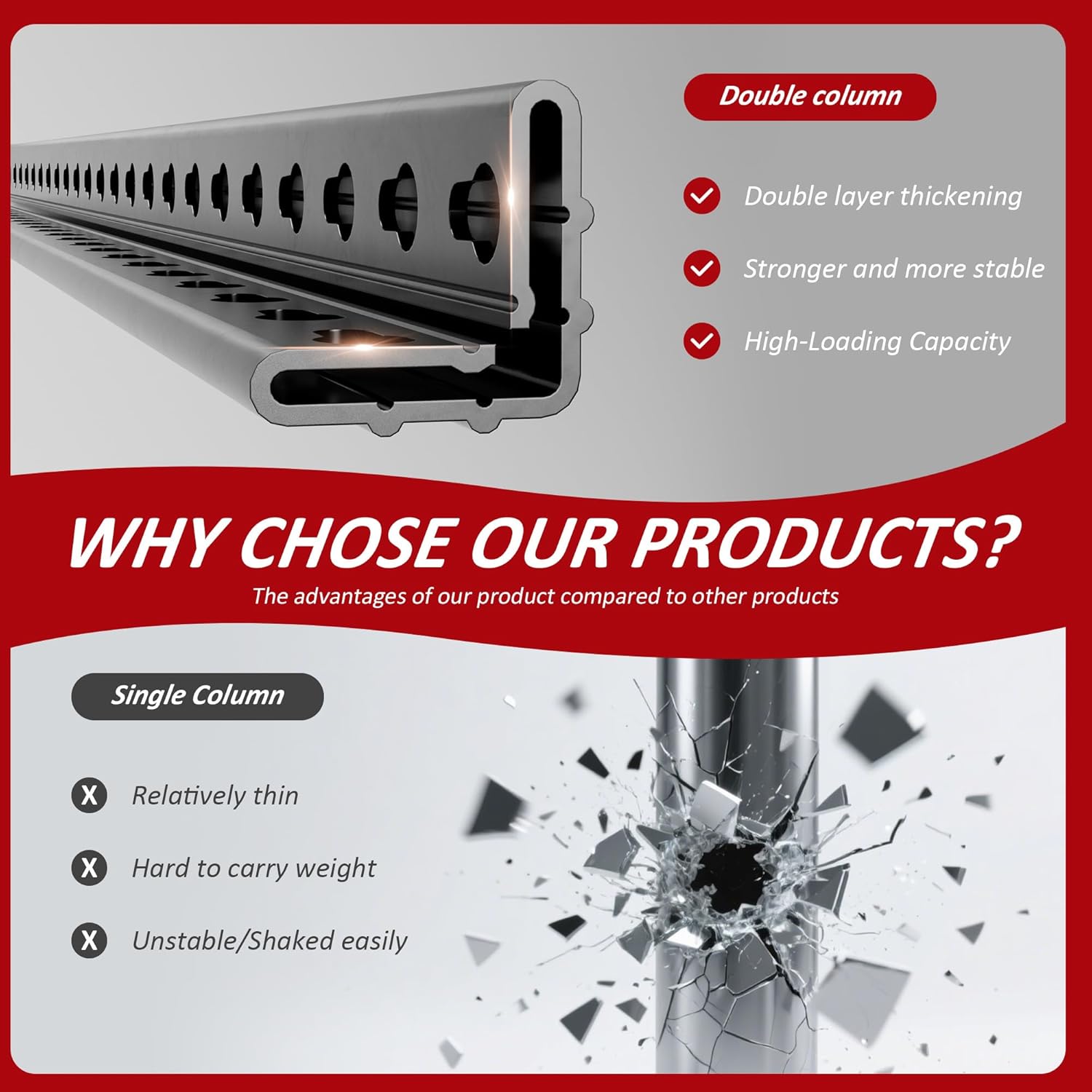 • Heavy Duty Garage Shelving Unit - This garage shelf is made of high-quality thickened cold-rolled steels and an anti-rust coating. The double-layer column design is stronger than the single-layer column, with a maximum load-bearing capacity of 3030LBS and a single-layer load-bearing capacity of 606LBS