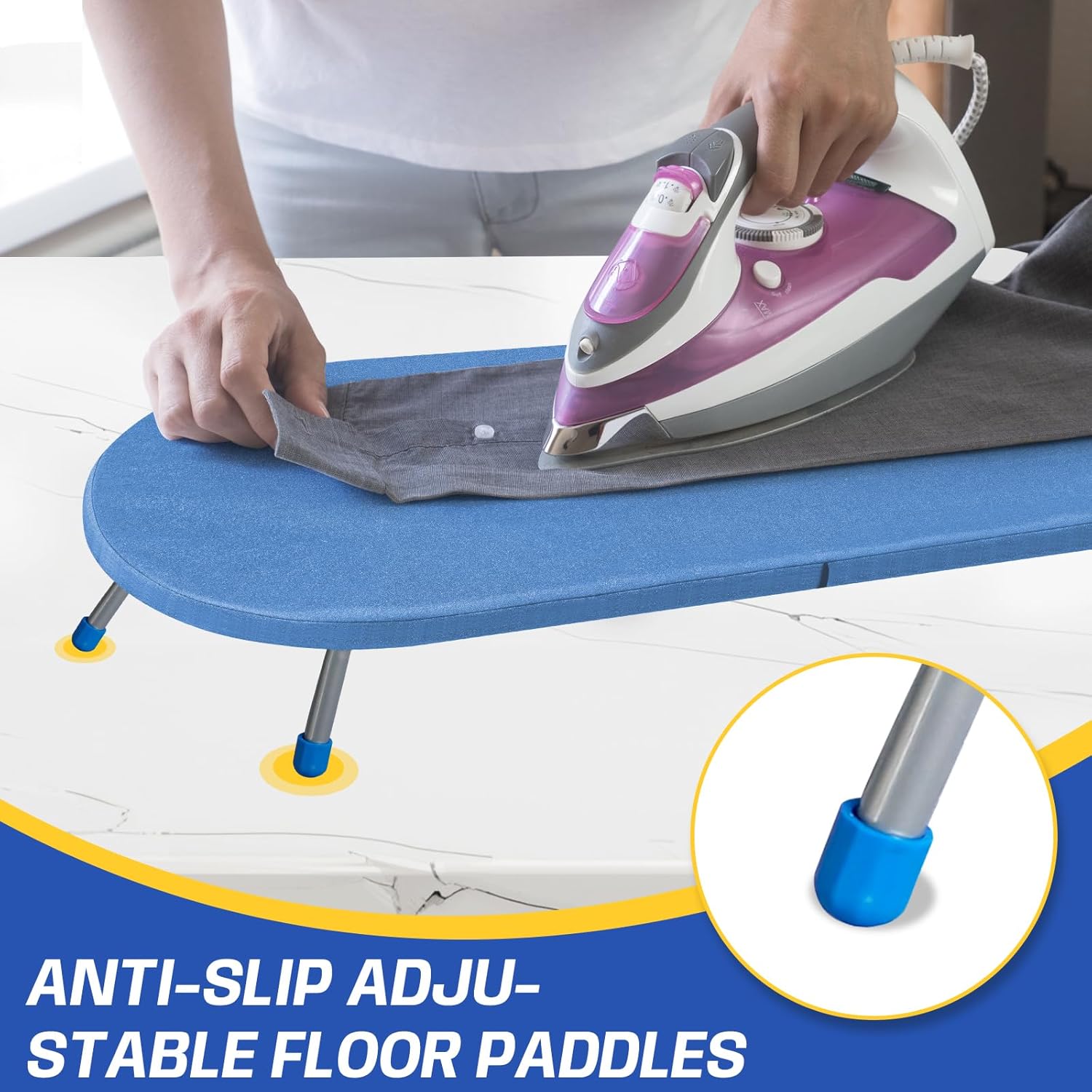 • 【Smooth-Surface Metal Mesh】The small ironing board with reinforced metal mesh ensures fast heat distribution for efficient ironing. Adjustable non-slip TRP feet protect floors and keep the board steady on uneven surfaces, while the breathable design prevents heat buildup.