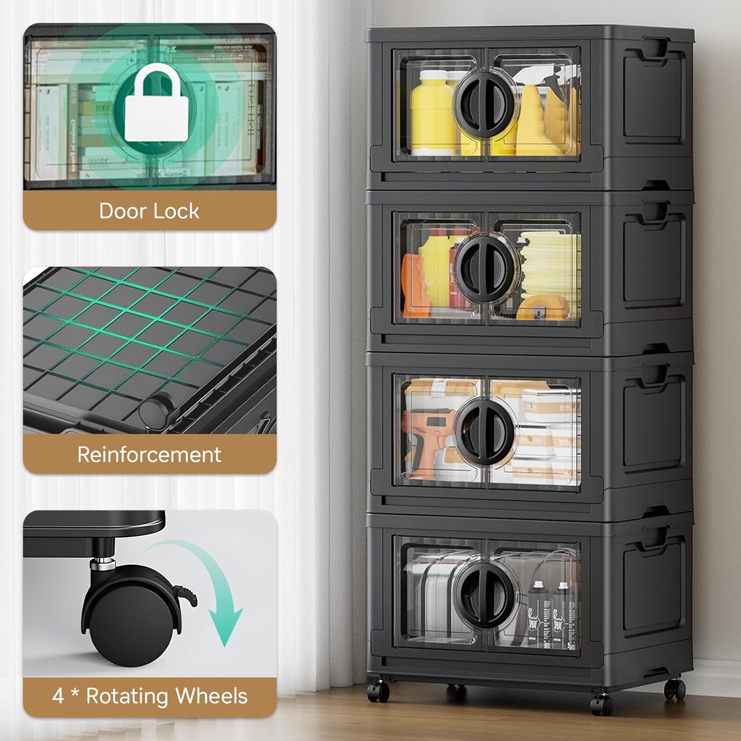 JEKO&JEKO 332Qt Lockable Stackable Storage Bins with Lids, Collapsible Closet Organizer with Wheels, Plastic Cabinet Drawer for Clothes, Dorm Room 4 Pack (Black)
