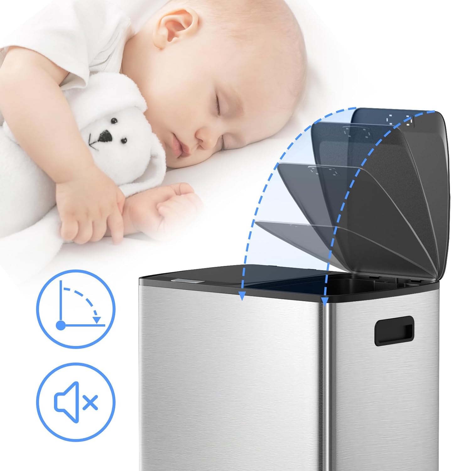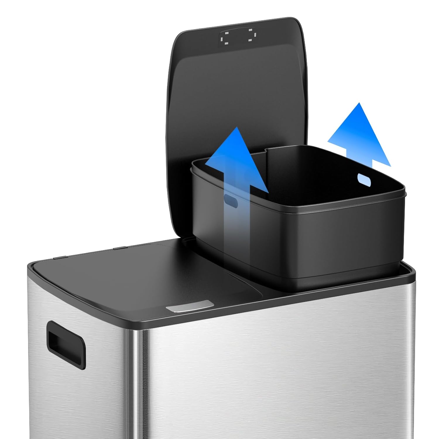 • EASY CARE: This kitchen trash can features a sturdy stainless steel body designed for long-lasting use. Its durable, fingerprint-proof finish keeps it looking clean. Two interior liner bucket is made of durable plastic and can be easily rinsed with mild soap and water.