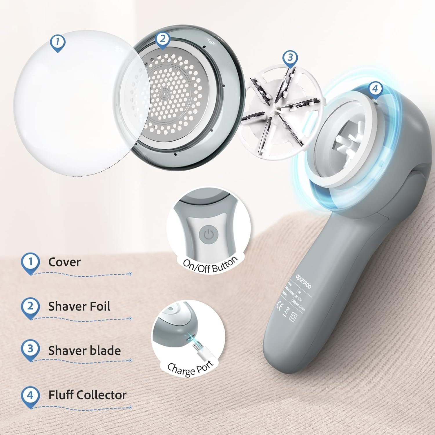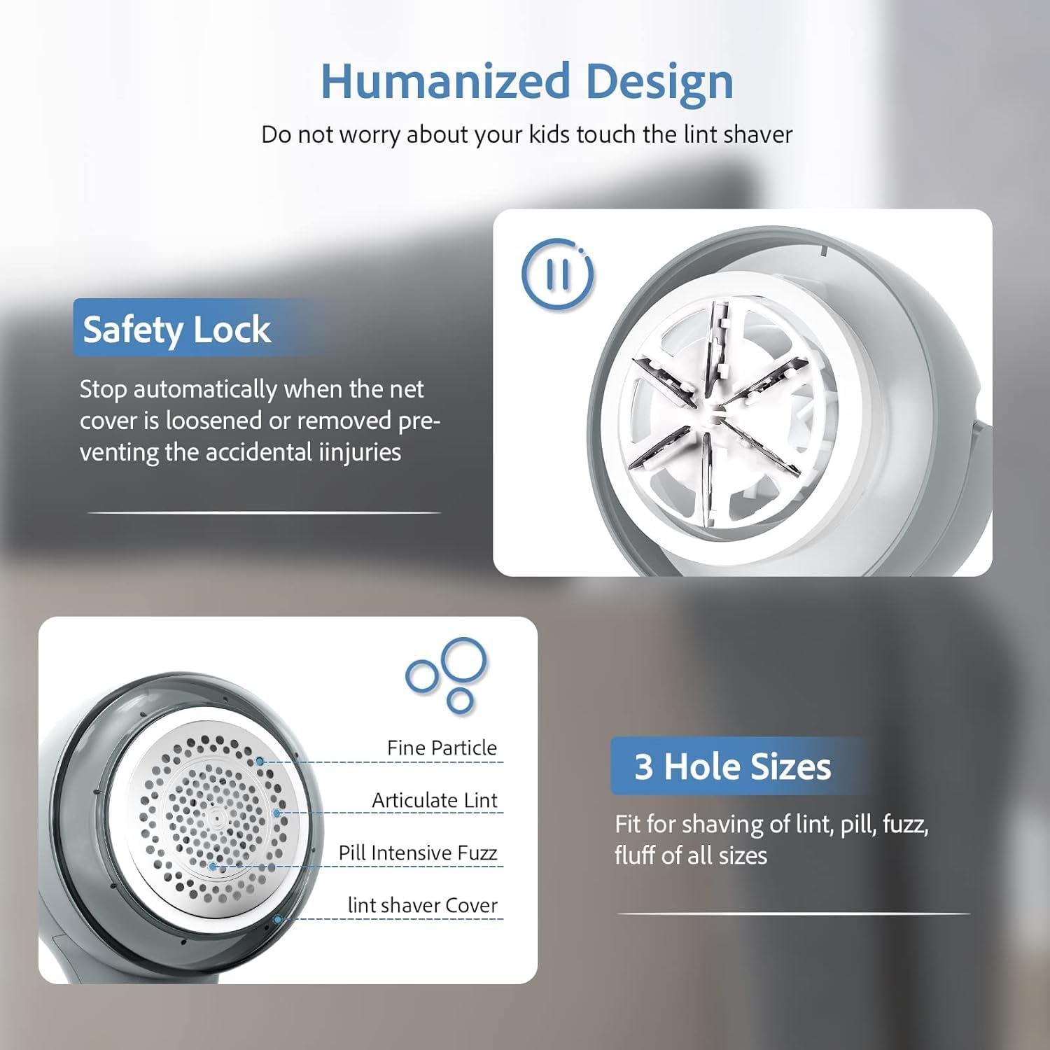 • Powerful Fabric Shaver for Clothing : Our electric fabric shaver comes with 2 speed settings, up to 9000RPM. Firstly, the mesh cover of this fabric shaver for furniture has 3 sizes of holes, which can quickly clean up different sizes lint, pilling, fuzz, pill . Secondly, compared to the traditional 3-leaf blades, we equip with 3pcs rust-proof 6-leaf blades, which can greatly improve the working efficiency of the rechargeable fabric shaver and meet the needs of all fabric surfaces.