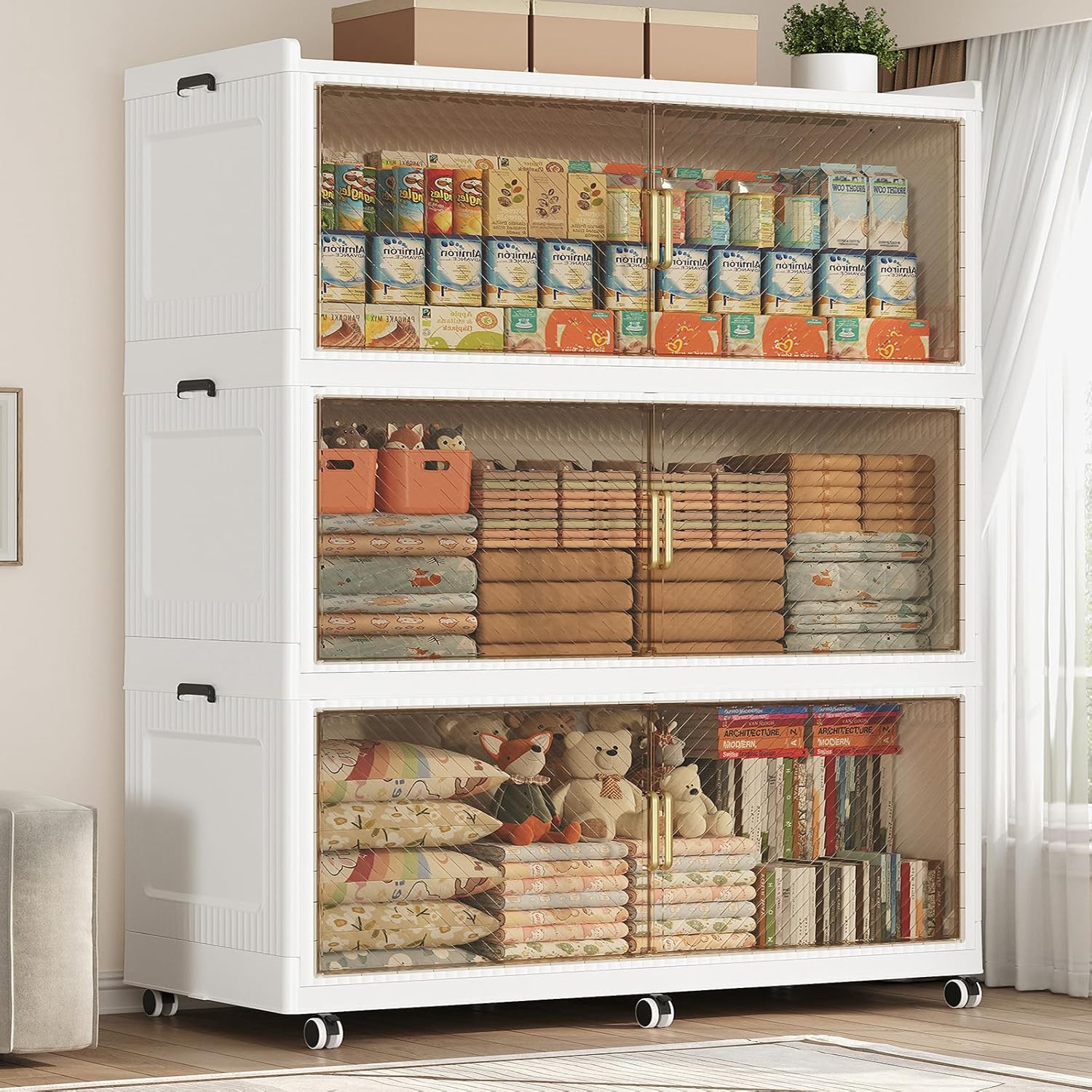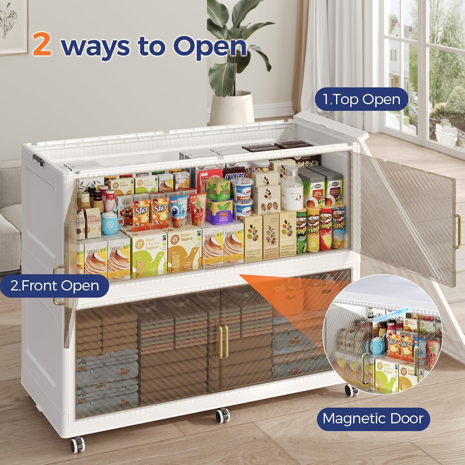 • 【Two Ways to Open & Magnetic Doors】The collapsible storage bins with lids and wheels feature a dual access way, allowing for both top and front door openings, and with clear brown windows for easy visibility. The super huge storage bins with open front doors are equipped with magnetic lock buckles to prevent dust from entering the cabinet.