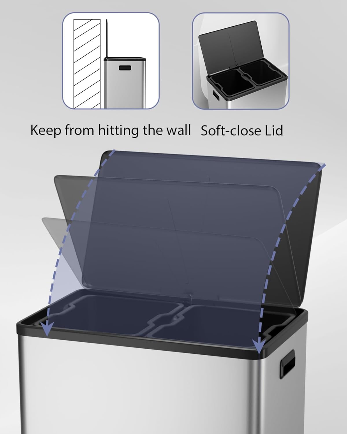 • Effortless Dual Sorting: 2 removable inner buckets (2 x 8 gallons/3L each) let you separate recyclables, compost, or general waste in one sleek unit. Perfect for dry/wet waste sorting.