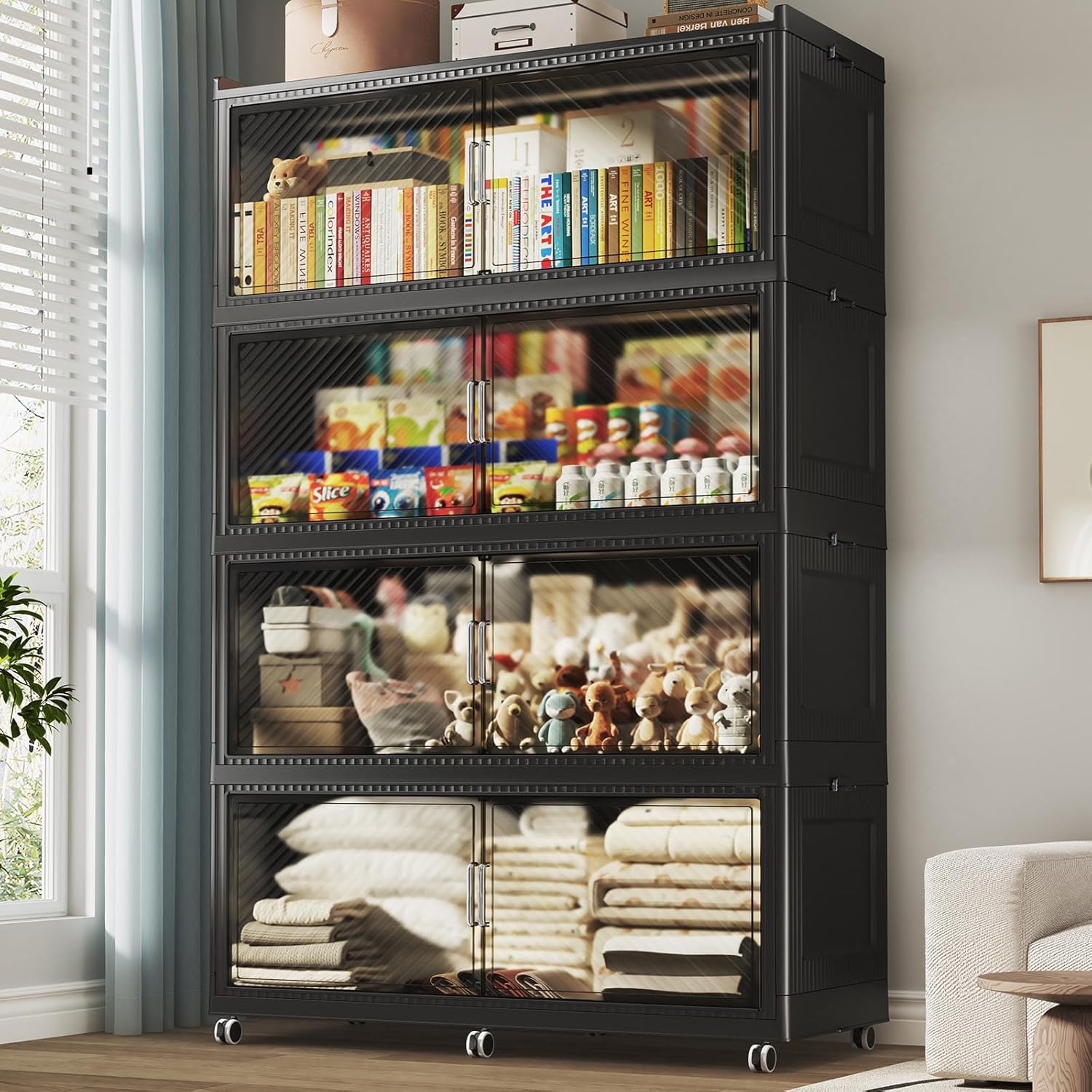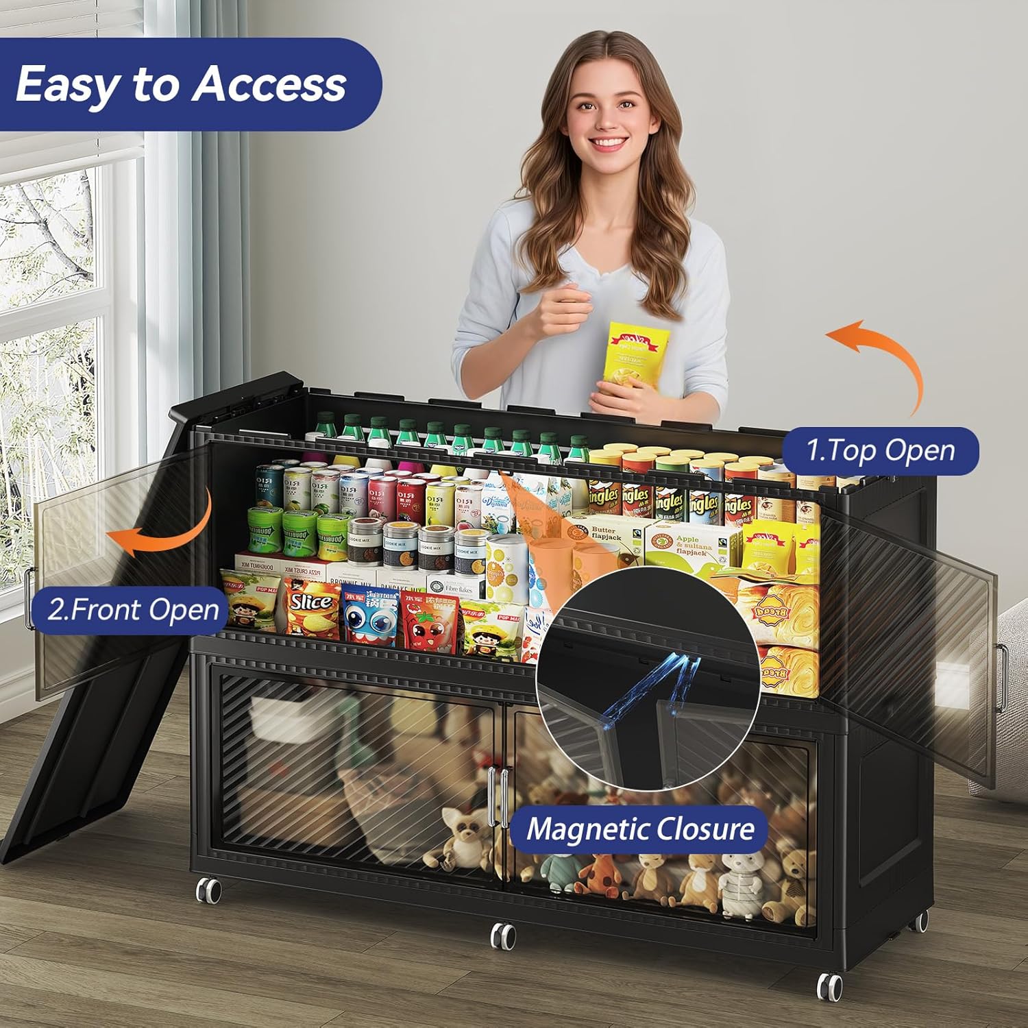 • 【Two Ways to Open & Magnetic Doors】The collapsible storage bins with lids and wheels feature a dual access way, allowing for both top and front door openings, and with clear brown windows for easy visibility. The super huge storage bins with open front doors are equipped with magnetic lock buckles to prevent dust from entering the cabinet.