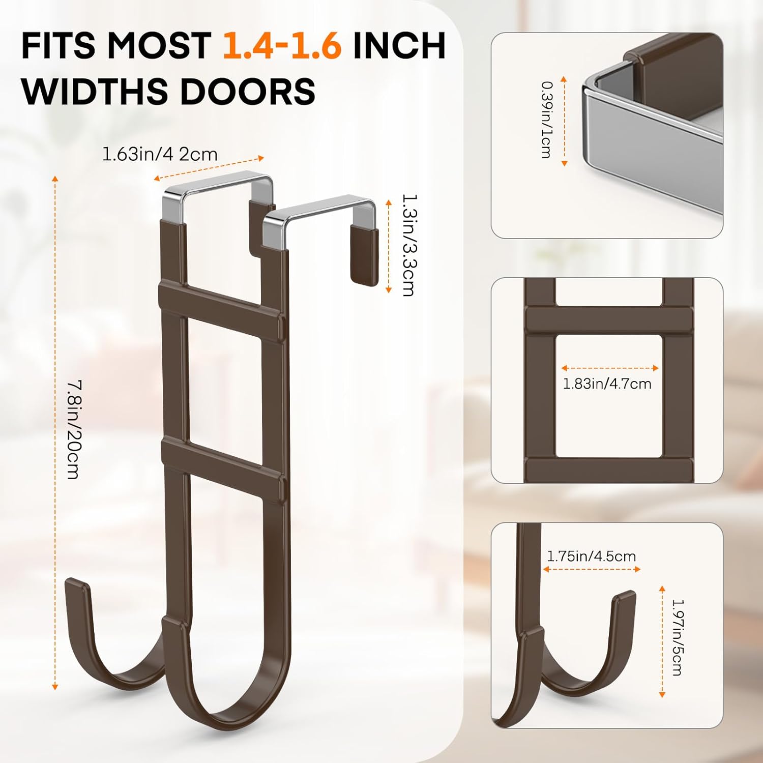 FYY Over The Door Hooks - 2 Pack Heavy Duty Dual-Hook Organizer Hanger with Non-Slip Rubber for Towels, Clothes, Hats & Bags Use in Bathroom, Bedroom, Kitchen - Fits Interior Doors Up to 1.6" Brown