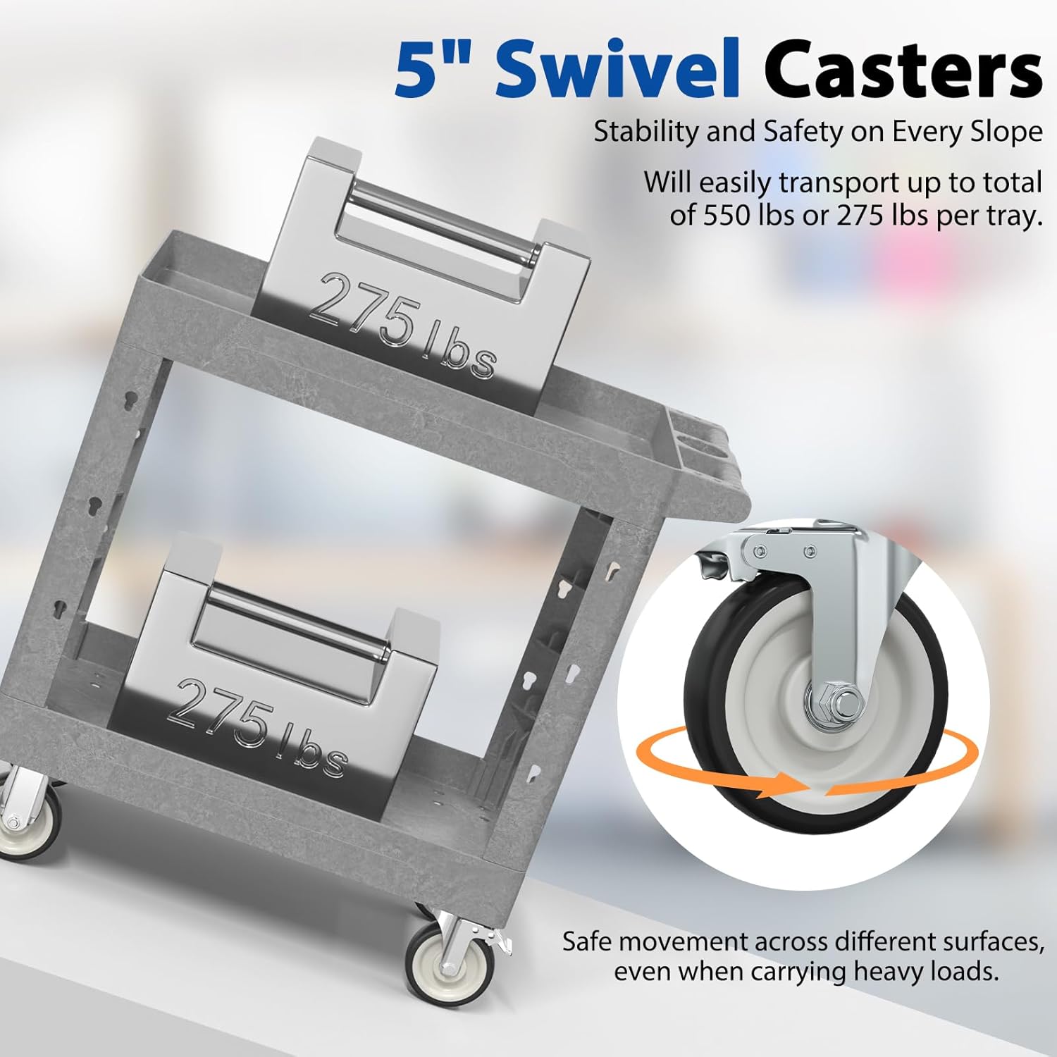 Heavy Duty Rolling Utility Cart with Wheels 2-Tier Utility Plastic Service Work Cart for Shop, Garage, Warehouse, Maintenance 550 lbs