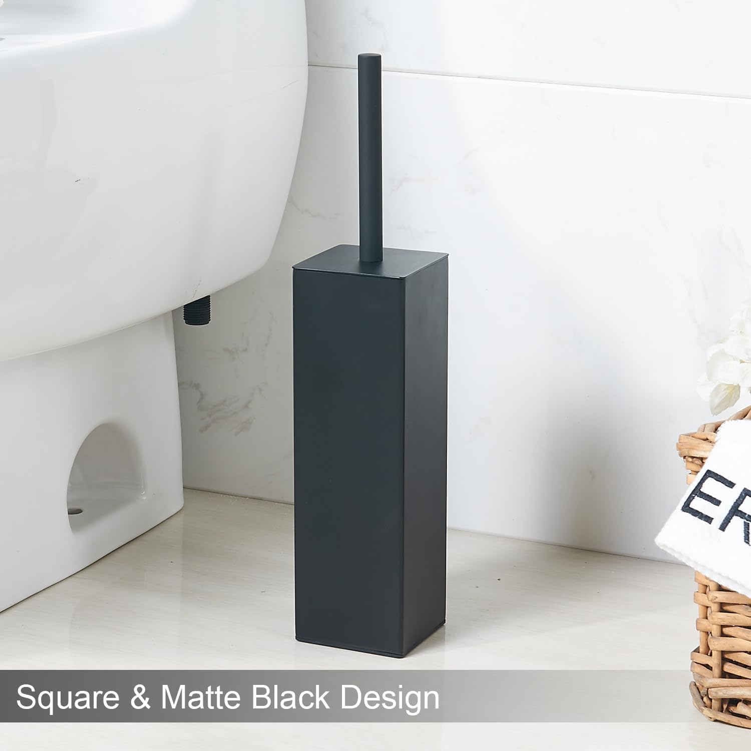 Matte Black Square Stainless Steel Toilet Brush with Holder, 304 Modern Toilet Brush Set – Rust Resistant, Long Handle, Replacement Heads, Floor Standing Bathroom Toilet Cleaning Brush