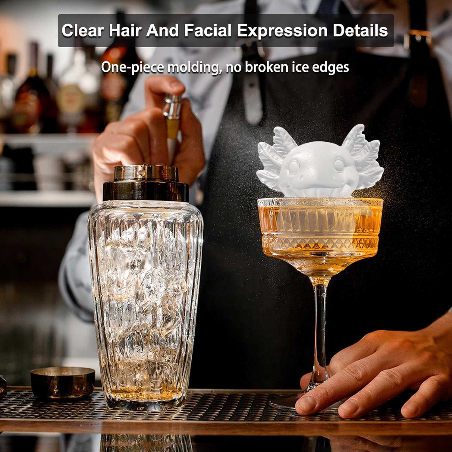 • 🧊Fun Axolotl Shaped Ice Cube Mold -- Our Ice Cube Mold can make cute Axolotl shaped ice cubes; it has a large size and is designed for whiskey glasses, which is very suitable for drinks that need to melt slowly, such as whiskey, cocktails, bourbon, rum, tequila, gin, etc.