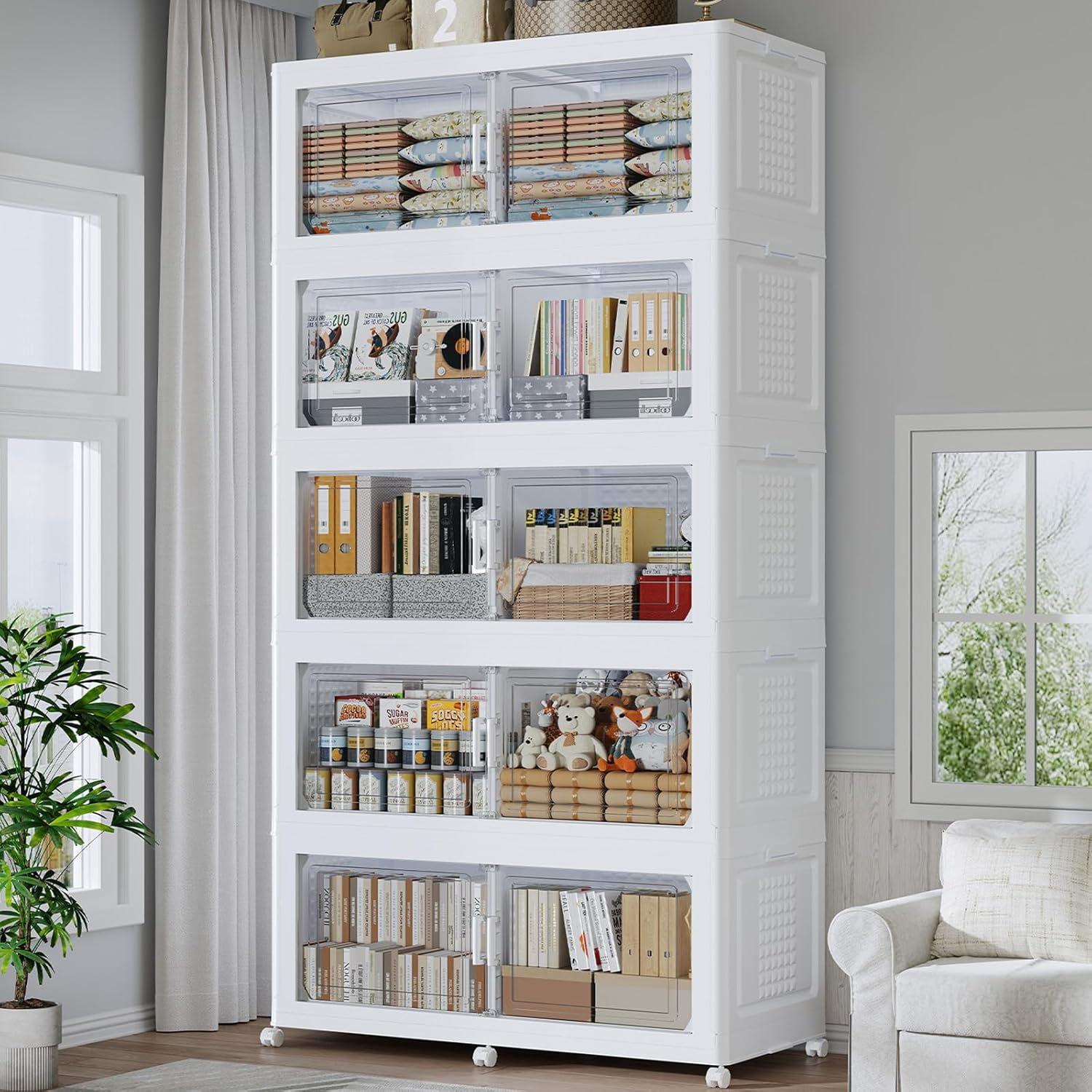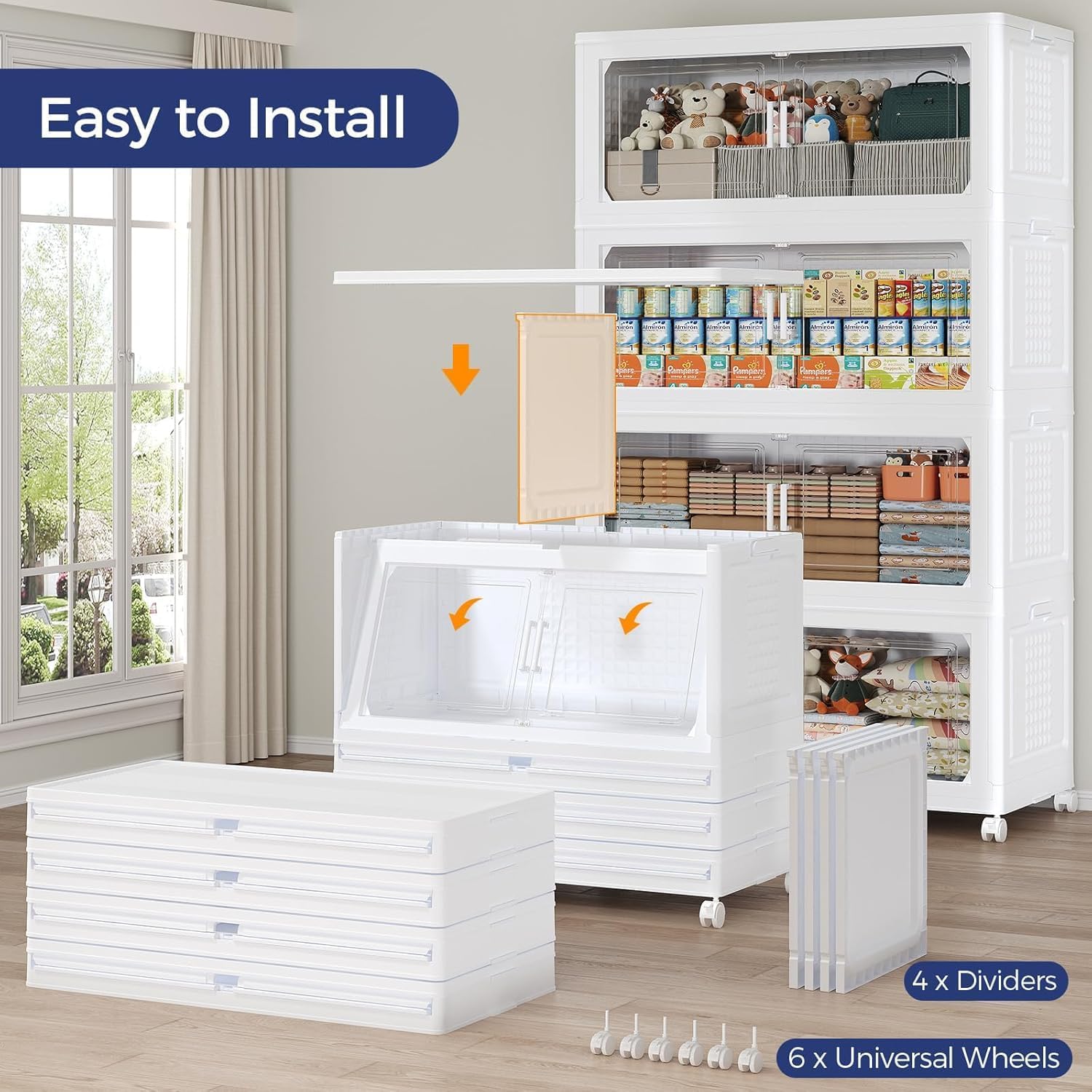 • 【Two Ways to Open & Clear Magnetic Door】The collapsible storage bins with lids and wheels feature a dual access way, allowing for both top and front door openings, and with clear windows for easy visibility. The stackable plastic storage bins with open front doors are equipped with magnetic lock buckles to prevent dust from entering the cabinet.