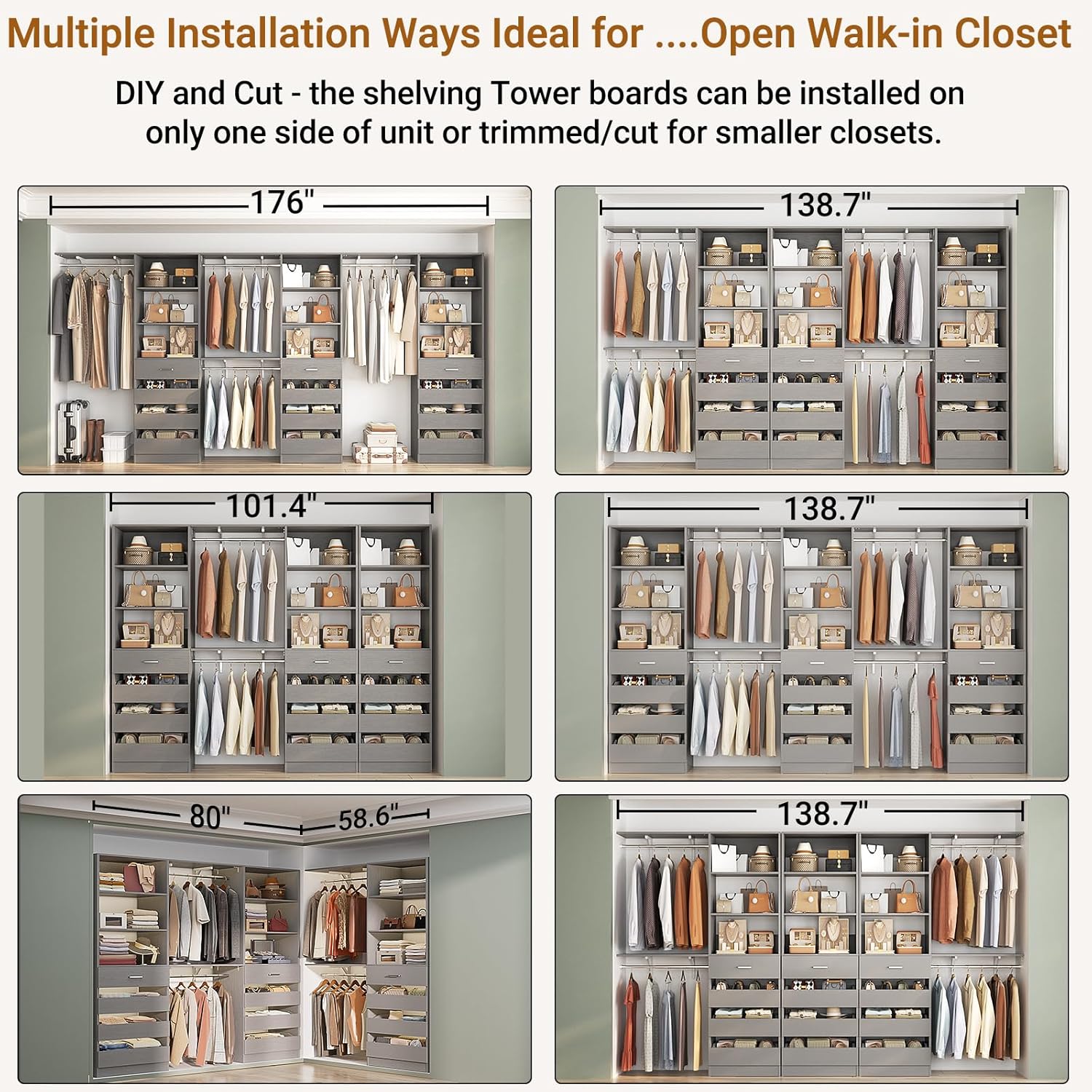 • 【Customize and DIY Your Dream Walk-in Closet】With 4 expandable hanging rods, 4 top shelves and 3 closet towers, you can easily create a personalized closet system tailored to your space. Home organization system for walk-in closet spaces to store shirts, jackets, sweaters, pants, shoes, or other décor items. Multiple Installation Ways, Cut to fit more Wide Spaces.