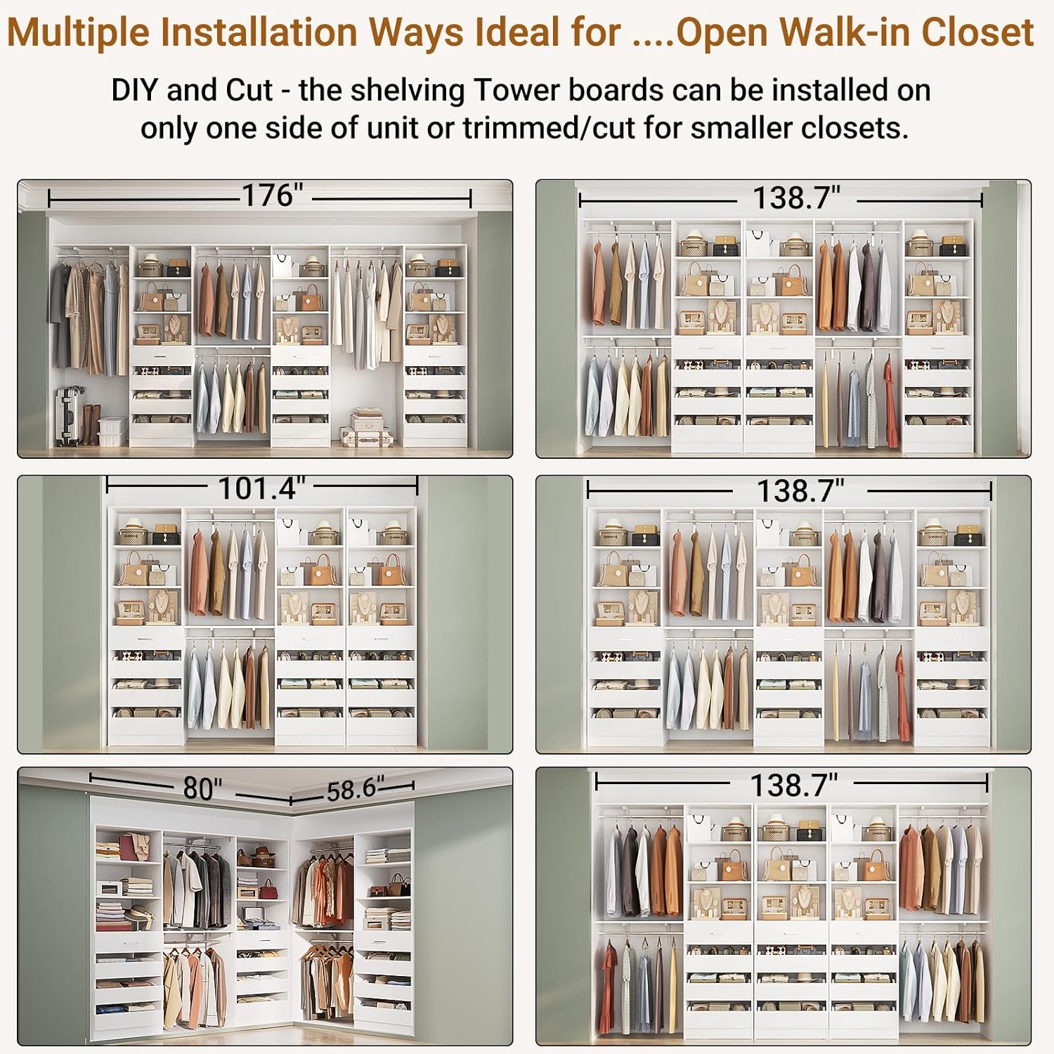 • 【Customize and DIY Your Dream Walk-in Closet】With 4 expandable hanging rods, 4 top shelves and 3 closet towers, you can easily create a personalized closet system tailored to your space. Home organization system for walk-in closet spaces to store shirts, jackets, sweaters, pants, shoes, or other décor items. Multiple Installation Ways, Cut to fit more Wide Spaces.