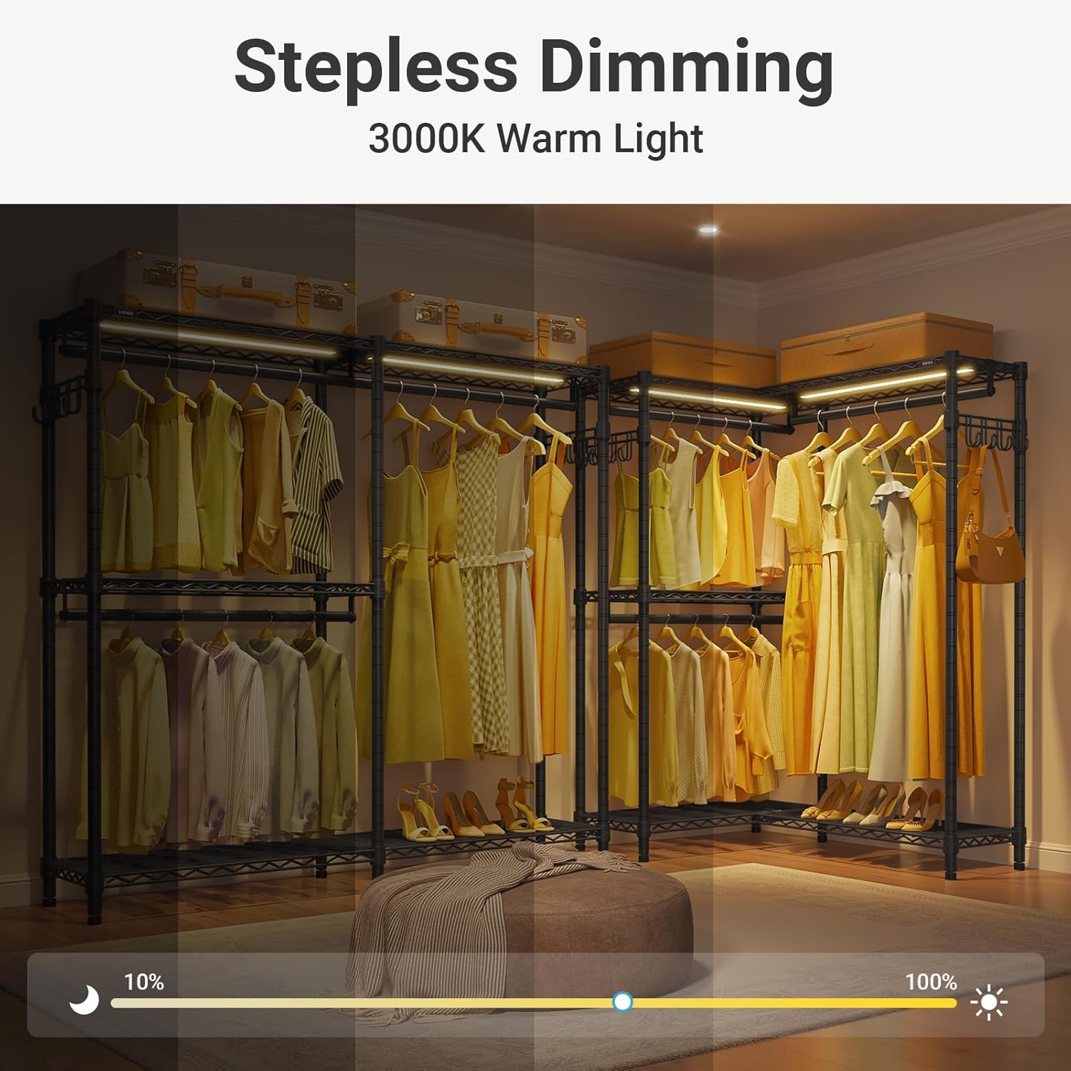 VIPEK L4L Portable Closet with Dimmable LED Lights, L Shaped Clothes Rack for Corner Space-Saving Storage, 3 Hanger rods for Hanging Heavy Duty Coats, Max Load 810LBS, Black
