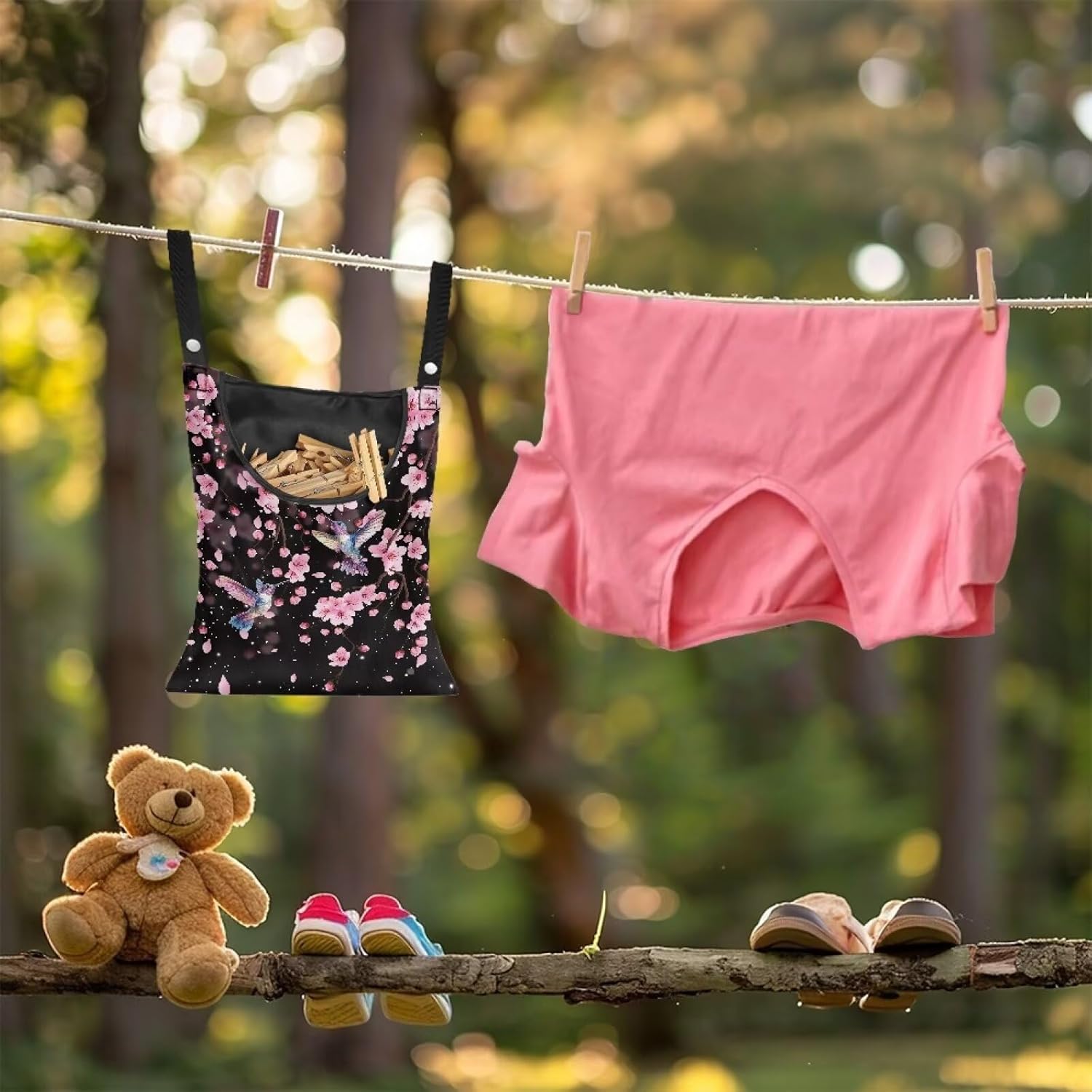 Waterproof Clothespin Bag with Hanger Hook Cherry Blossom Hummingbird - Large Opening Organizer for Balcony, Laundry Room & Apartment Use