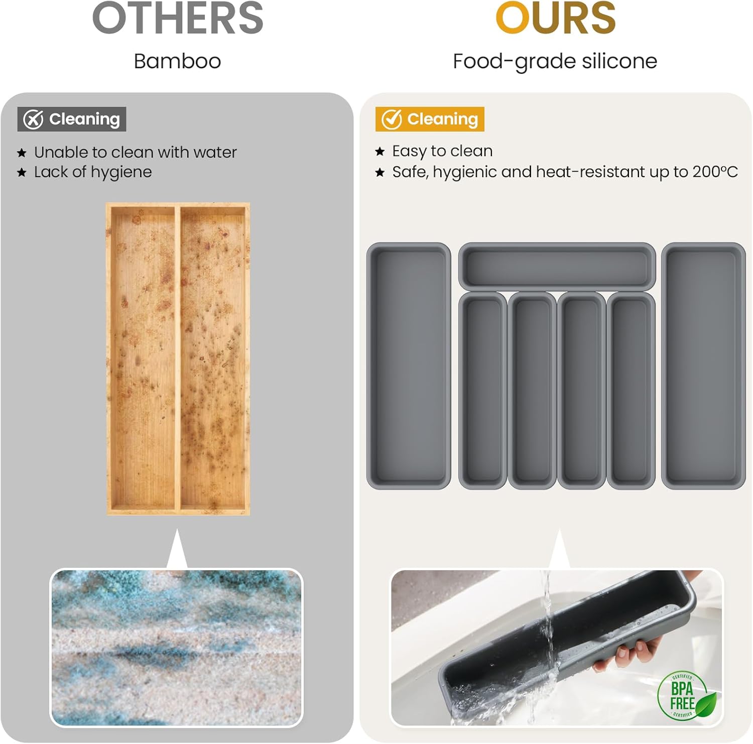 7 Pack Silicone Silverware Drawer Organizer, DIY Free Combination Kitchen Drawer Organizer, Utensil Organizer, Moisture-proof and Heat-resistant up to 200°C, Anti-slip and Environmentally (Grey)