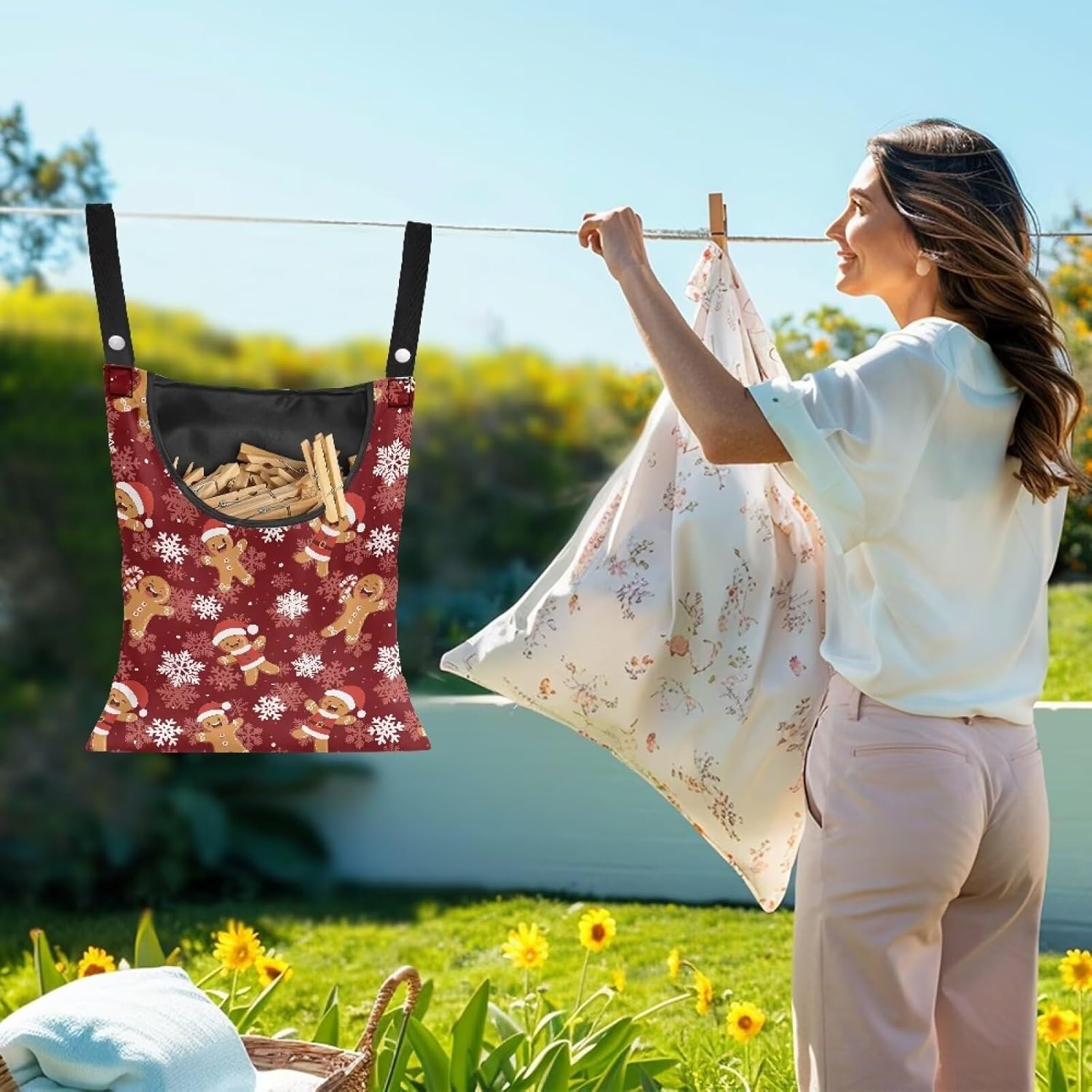 Christmas Gingerbread Man Waterproof Clothespin Organizer - Hanging Hook & Large Opening for Beach House, Laundry Room Decor