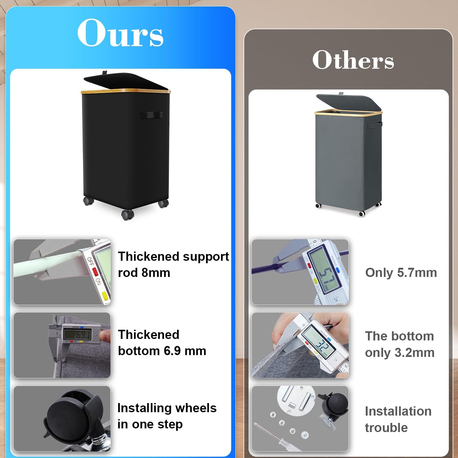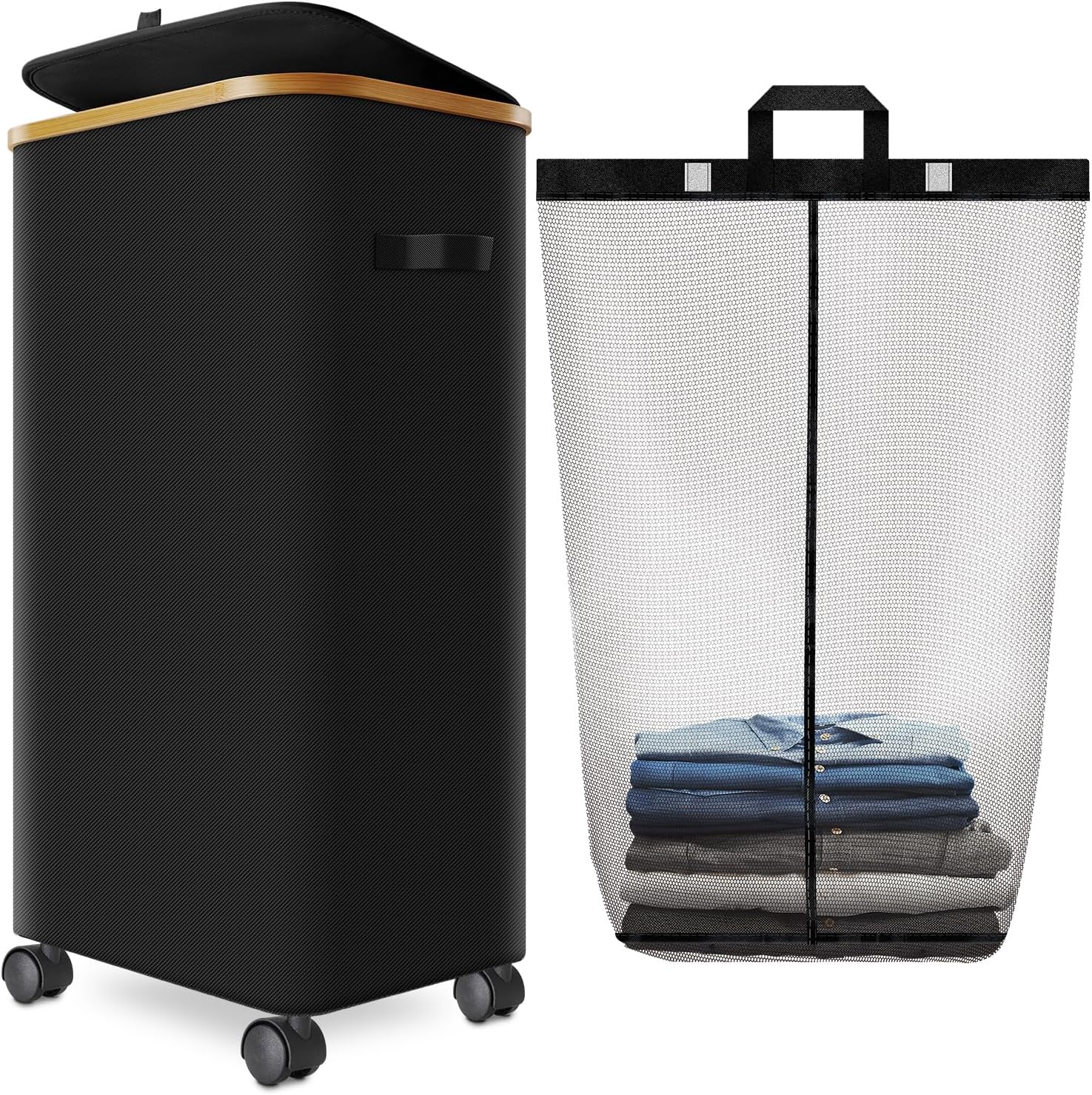 Laundry Hamper with Wheels,29 Gal (110L) Laundry Basket with lid Rolling Clothes Hamper Foldable Dirty Clothes Basket on wheels with Bamboo Frame and Bag for Bedroom, Dorm, Laundry Room-Black