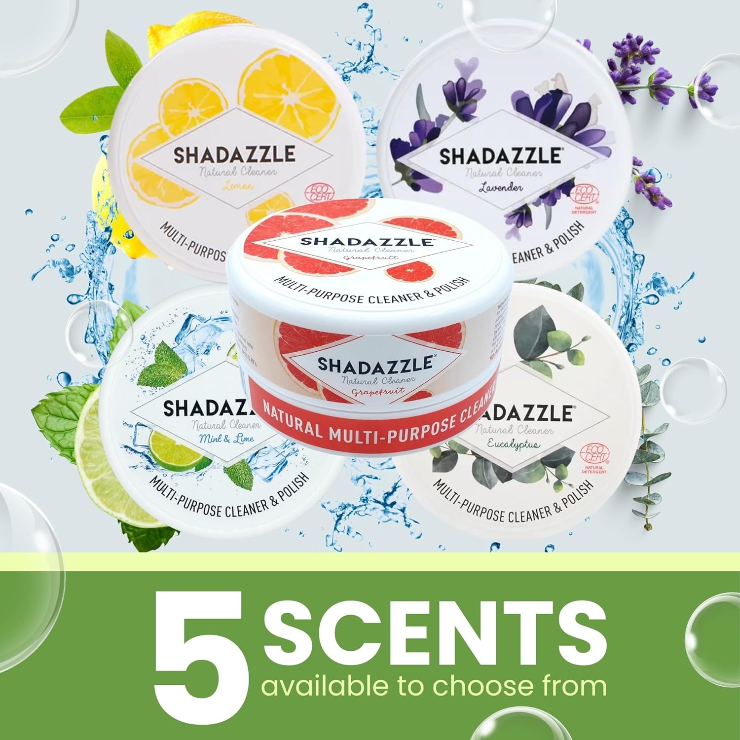 • NATURAL ALL PURPOSE CLEANER : Shadazzle is a multi purpose cleaner that works on any washable surface. It is made with natural ingredients only : clay, vegetal oil, vegetal glycerin, eucalyptus fragrance. No harmful chemicals or phosphates !