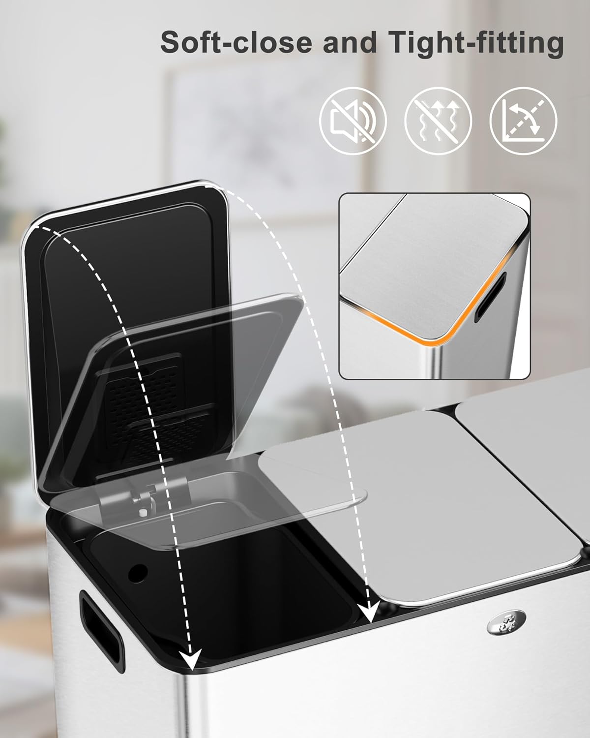 • Triple Compartment Design: Features three 7.9-gallon (30L) inner barrels for effortless sorting of dry/wet, recyclable, and non-recyclable waste—ideal for efficient kitchen organization.