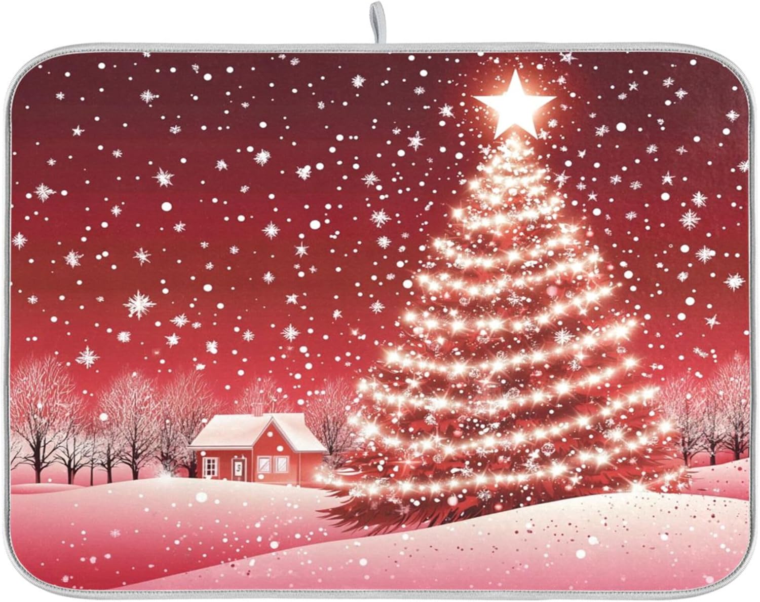 Christmas Tree Red Dish Drying Mat for Kitchen Countertop 16x18 Winter Snow Cabin Xmas Small Drying Mat Reusable Quick Dry Dish Sink Mats Easy Clean Decorative Essentials