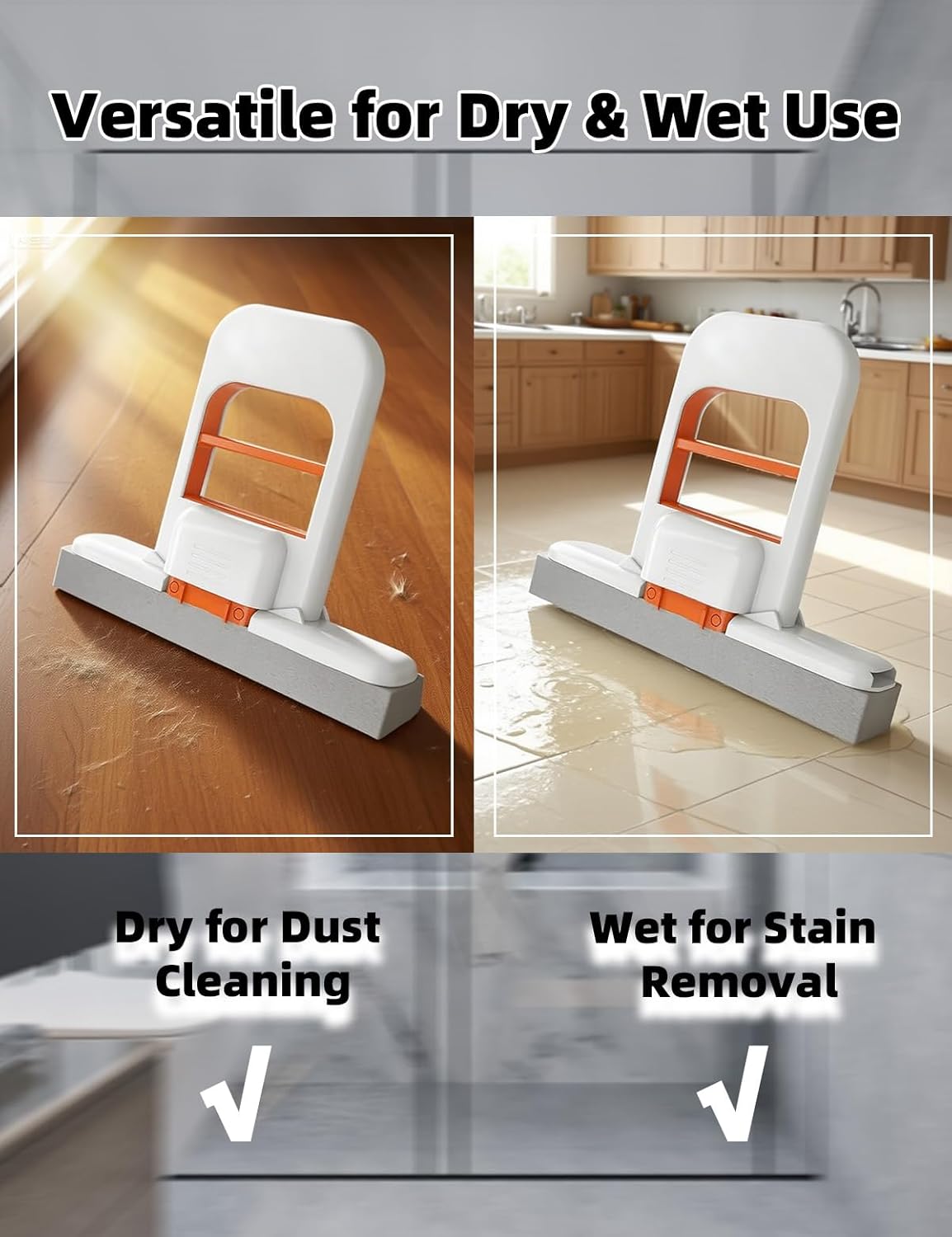 • Hands-Free Self-Squeeze Design: Sponge mop ergonomic handle enables one-hand operation to wring water—no messy hand-washing. Keeps hands clean and dry, reducing strain during wet or dry use for quick cleanups