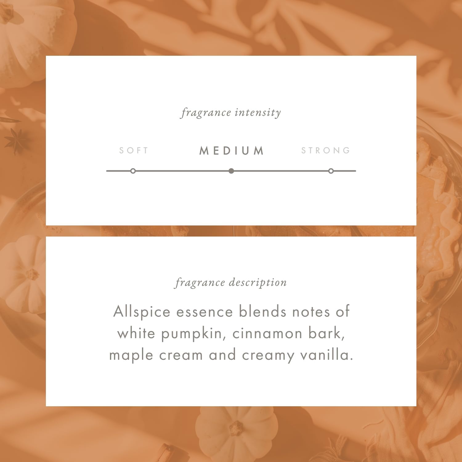 • Cozy Seasonal Spice Scent – A medium-strength fragrance where allspice essence blends with white pumpkin, cinnamon bark, maple cream, and creamy vanilla. Warm top notes of amber, mandarin, and allspice flow into a heart of pumpkin and cinnamon, finished with a comforting base of maple cream, guaiacwood, and vanilla. From the Seasonal–Spice family, it smells like baking a holiday favorite for the Thanksgiving table.