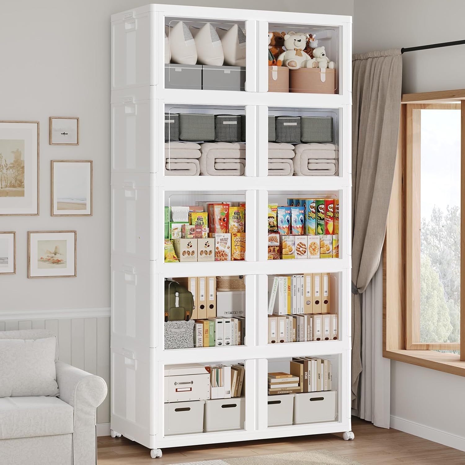 250GAL Large Stackable Storage Bins with Lid and Wheels, 1000Qt Collapsible Organizer Cabinet with Clear Door, for Closet, Bedroom, Kitchen, Garage, 5-Pack White