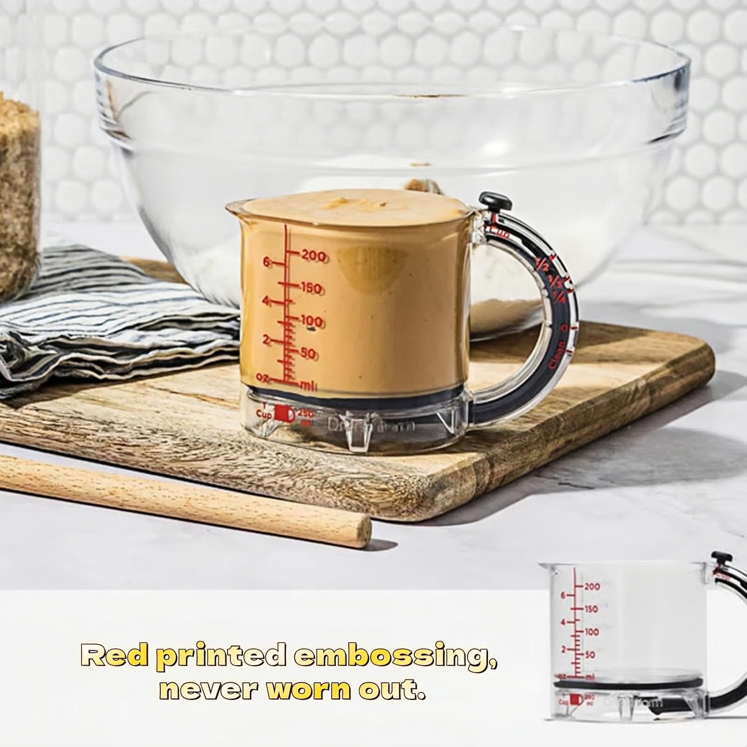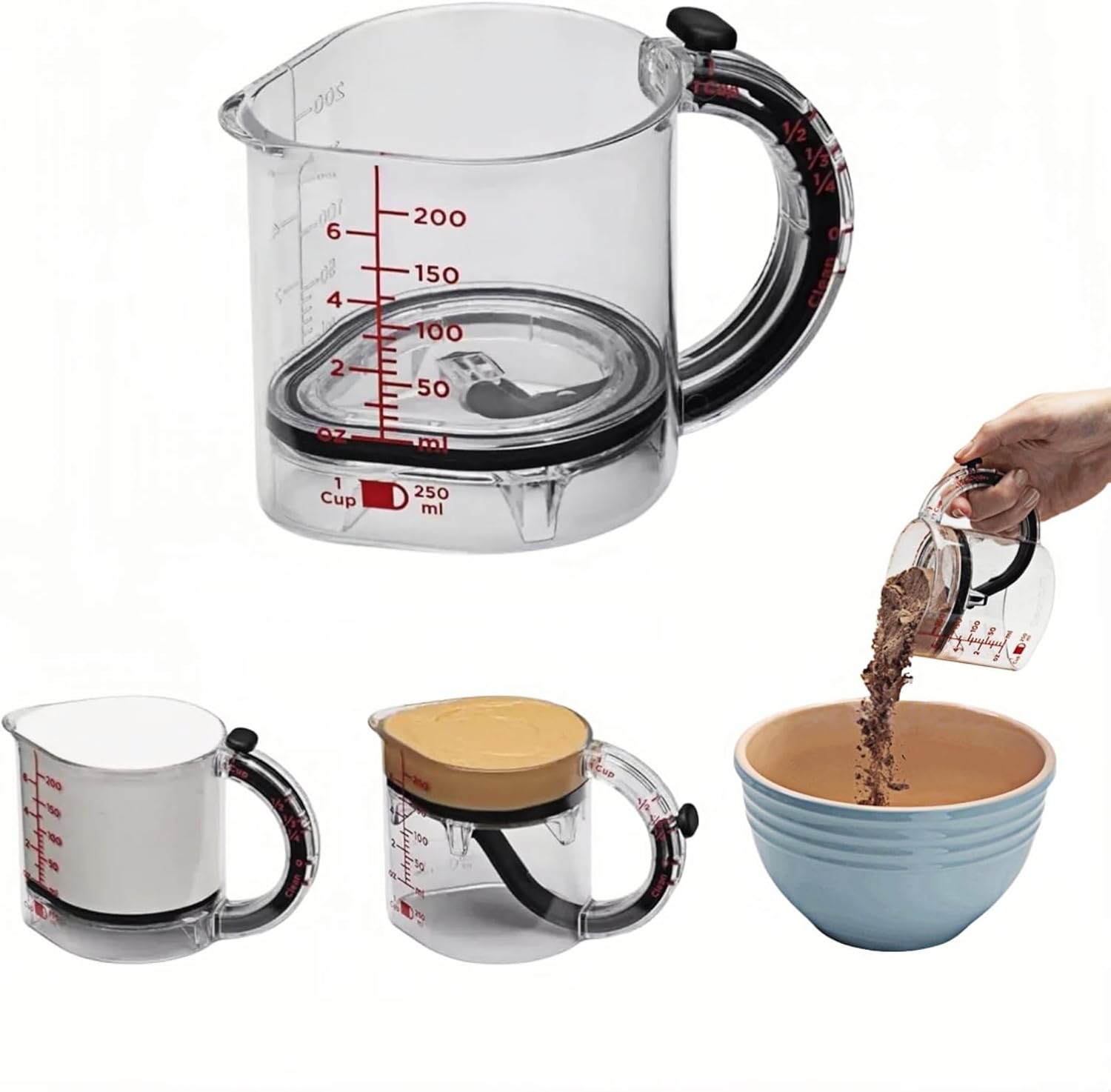 • 【4 in 1 Measuring Cup】This adjustable measuring cup is easy to use and versatile. One tool can accurately measure 1 cup, 1/2 cup, 1/3 cup, and 1/4 cup, eliminating the need to rummage through boxes and cabinets to find a pile of measuring cups