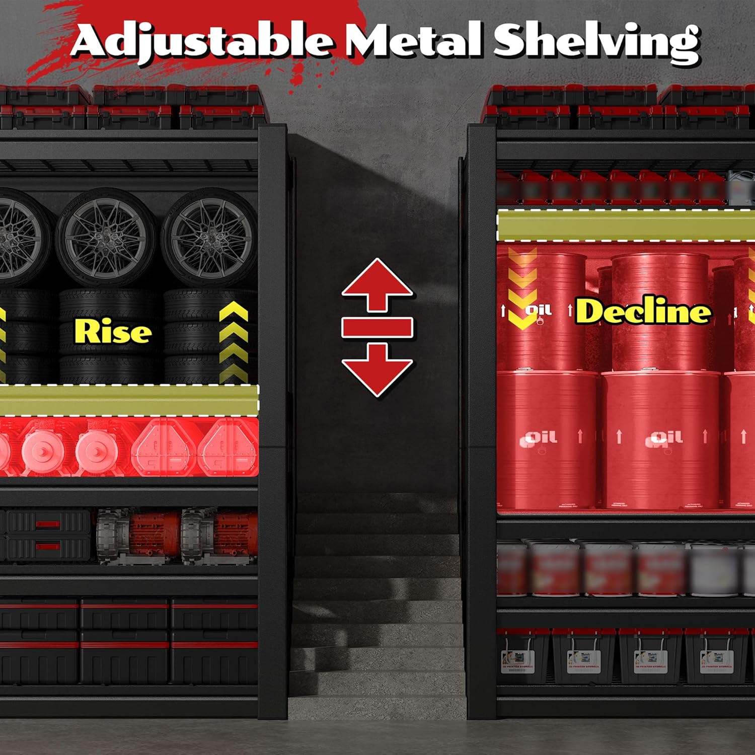 • 【Flexible Storage Shelves with Adjustable Height】Shelf heights are fully adjustable to accommodate items of any size, from paint cans to tall toolboxes. For added flexibility, the shelving unit can be divided into two separate racks, solving space challenges under workbenches or in cramped corners for a customized storage solution. Customization is simple