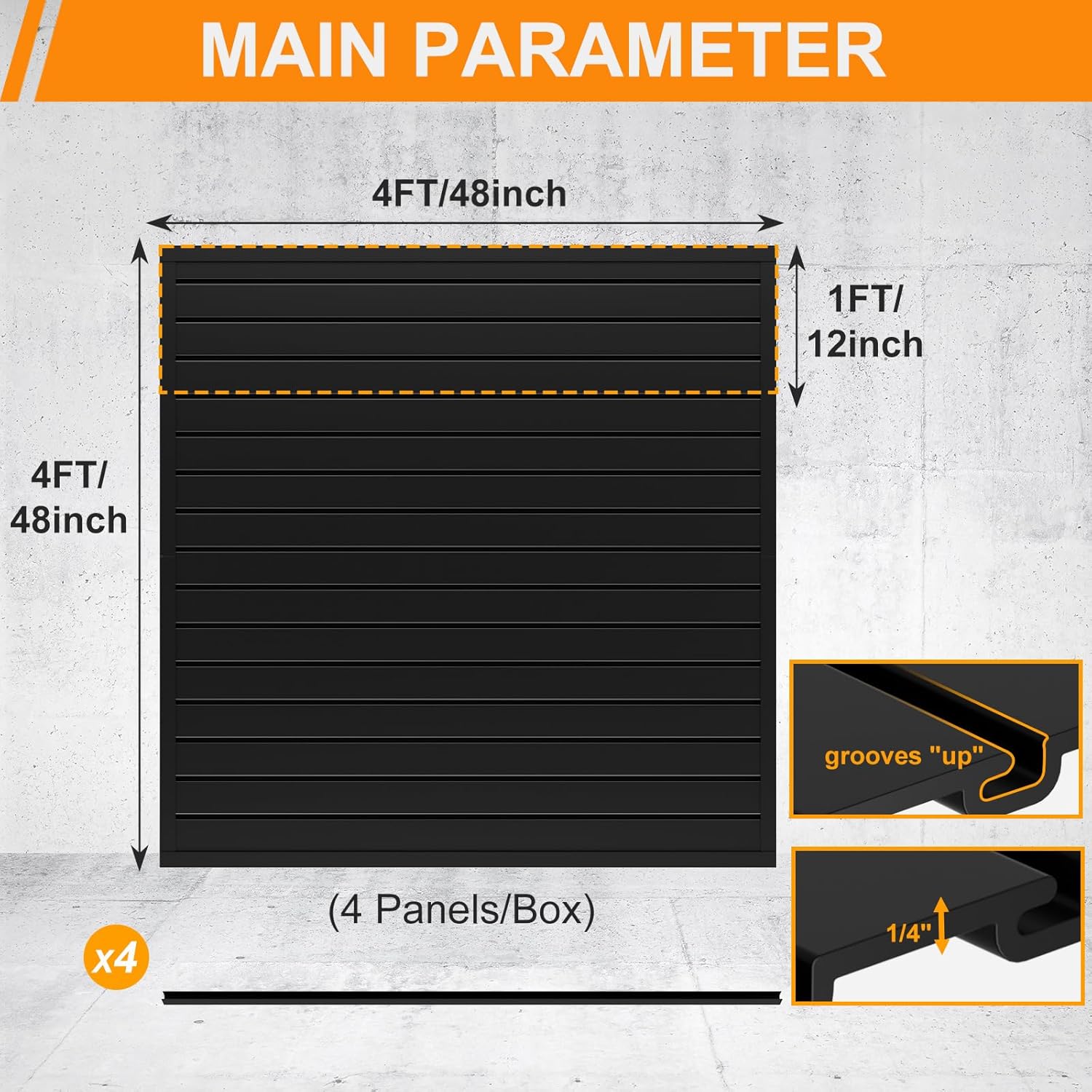 DoCred Slatwall Paneling Organizer, 4x4 FT PVC Garage Slat Wall Storage Systems, Heavy Duty Mounted Slat Peg Board for Tool Organization Ladder Bike Rack (Black)