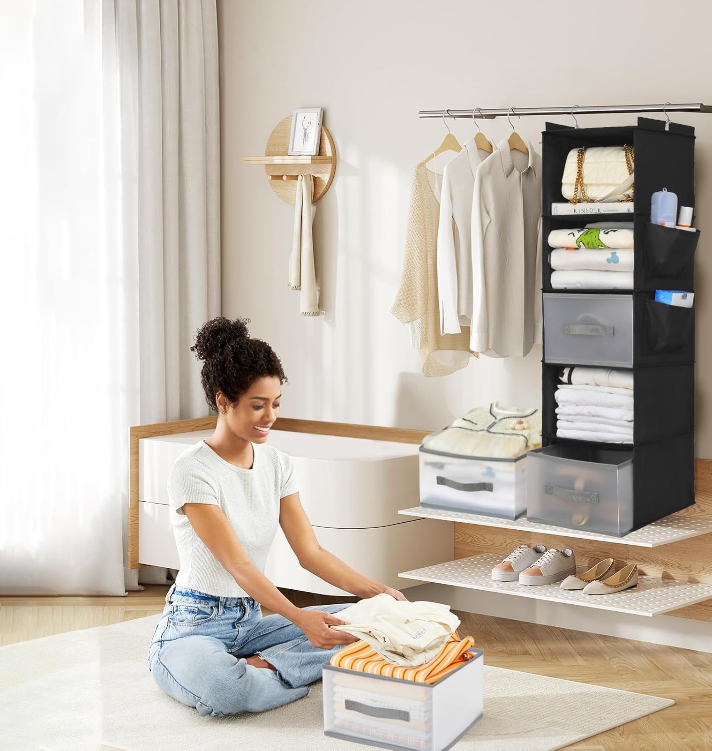 5-Layer Suspended Fabric Shelf Organizer, Equipped with 2 Sturdy Hooks, 2 Separate Drawers, and Foldable Hanging Storage (Black)